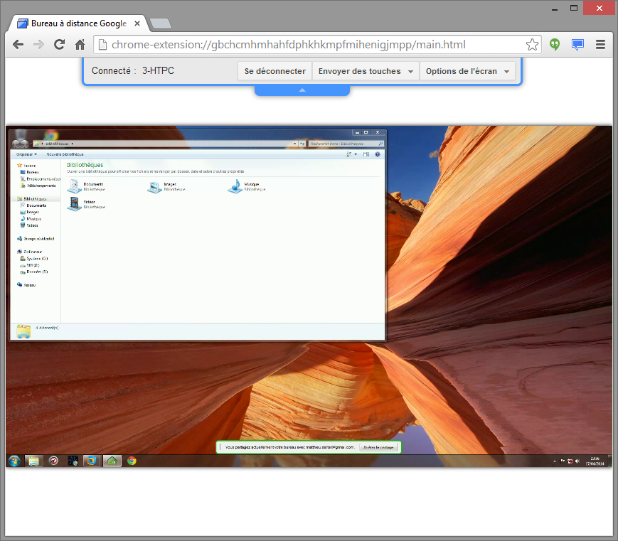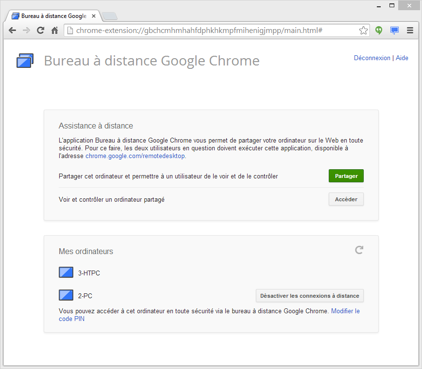 Pour rendre un ordinateur accessible à distance, il suffit en effet d’y installer Chrome puis d’ajouter à partir du Chrome Webstore l’application Bureau à distance et de suivre les instructions pour activer le partage, qui pourra se faire soit via votre compte Google (avec un code PIN en plus de l’identifiant du compte), soit vers n’importe quel autre utilisateur en lui donnant un accès temporaire via un code d’accès à usage unique. Notez qu’une fois le partage activé, vous pouvez déconnecter Chrome de votre compte Google. Pratique pour pouvoir vous donner un accès à distant sur l’ordinateur d’un tiers que vous dépannez souvent 🙂